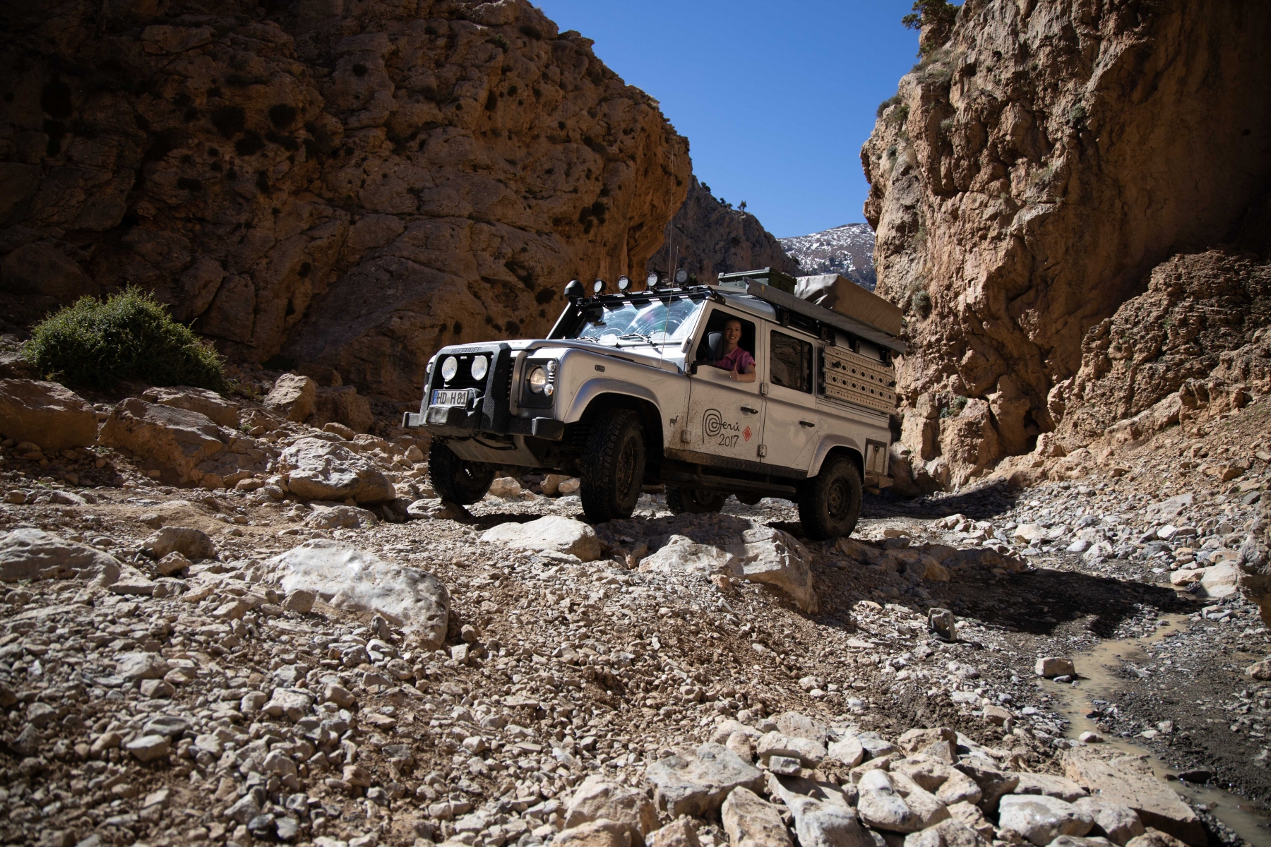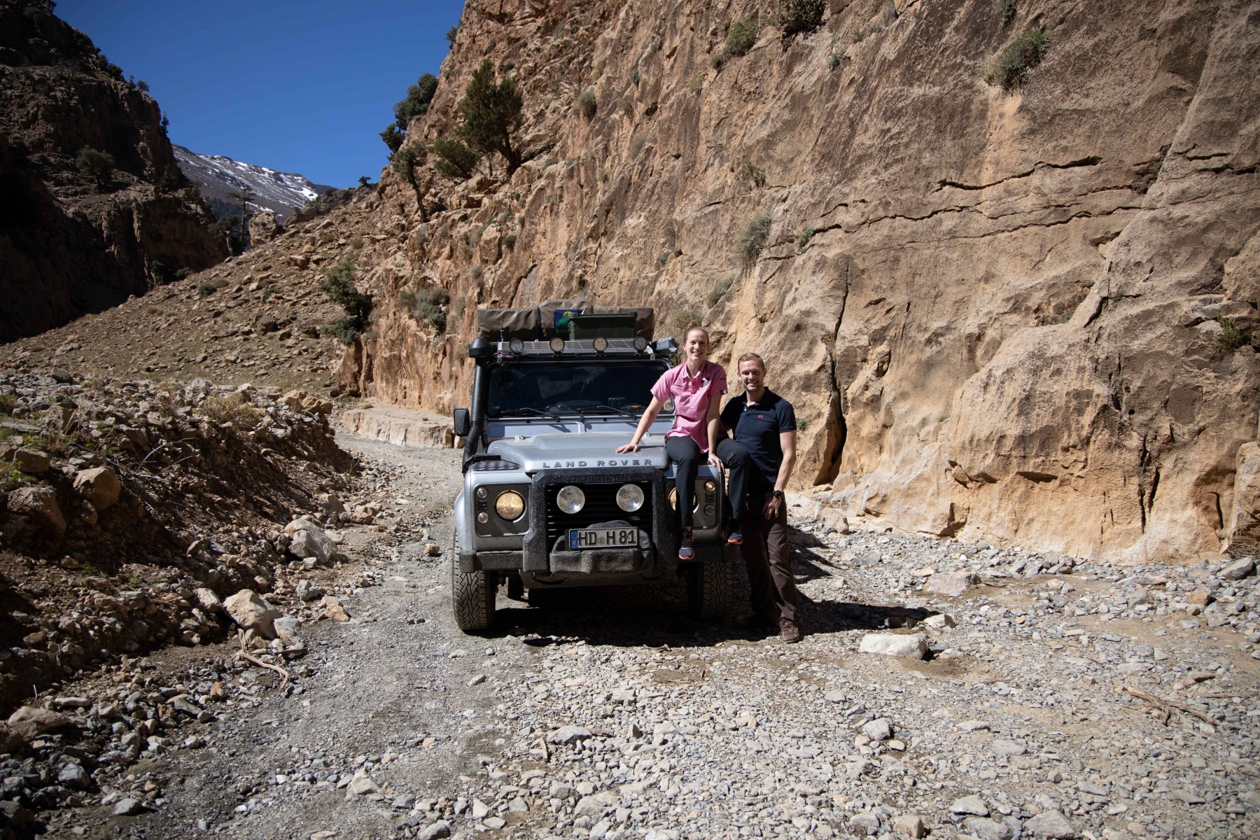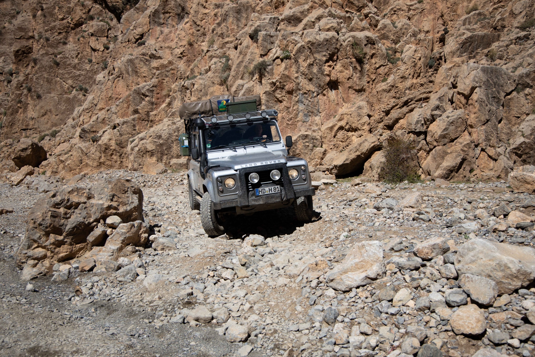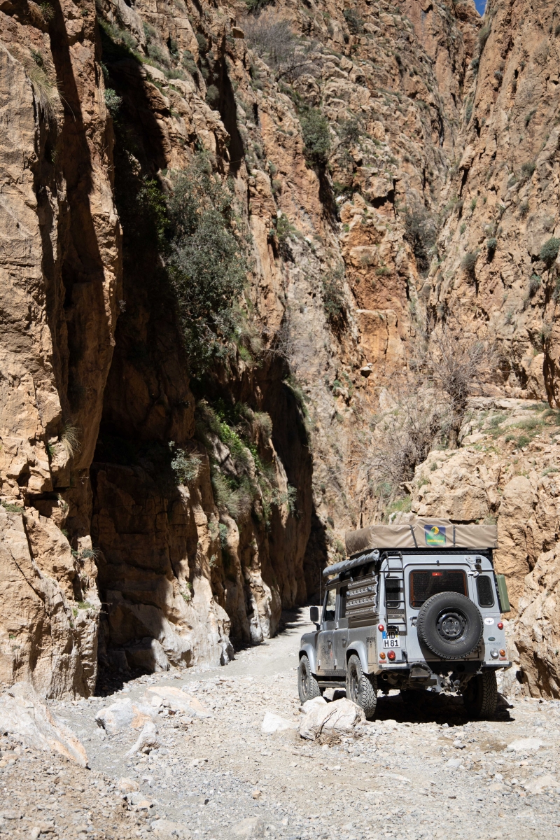 Die neue Route war aber nicht minder abenteuerlich, wenn man das, worauf wir uns per Internetrecherche vorbereitet haben, mit dem vor uns Liegenden vergleicht. Es geht über Stock und Stein und wir müssen richtig hart arbeiten, um unseren Landy sicher durch die Schlucht zu fahren. Teilweise geht es nur mit Untersetzungsgetriebe und Differenzialsperre im Schneckentempo voran, um Mensch und Material vor Schäden zu bewahren. Aber genau das wollten wir auch. Ein paar der Berber begleiten uns (also auch die Spanier, mit denen wir immer noch eine Gruppe bilden). Das hat jedoch Kalkül: man hilft uns (auch ungewollt) und verlangt hinterher Geld, Essen oder gebrauchte Klamotten für die „geleisteten Dienste“. Das wird mit der Zeit sehr anstrengend und verlangt viel Geduld. Als wir aus der Schlucht hinaus sind, öffnet sich die Landschaft erneut.