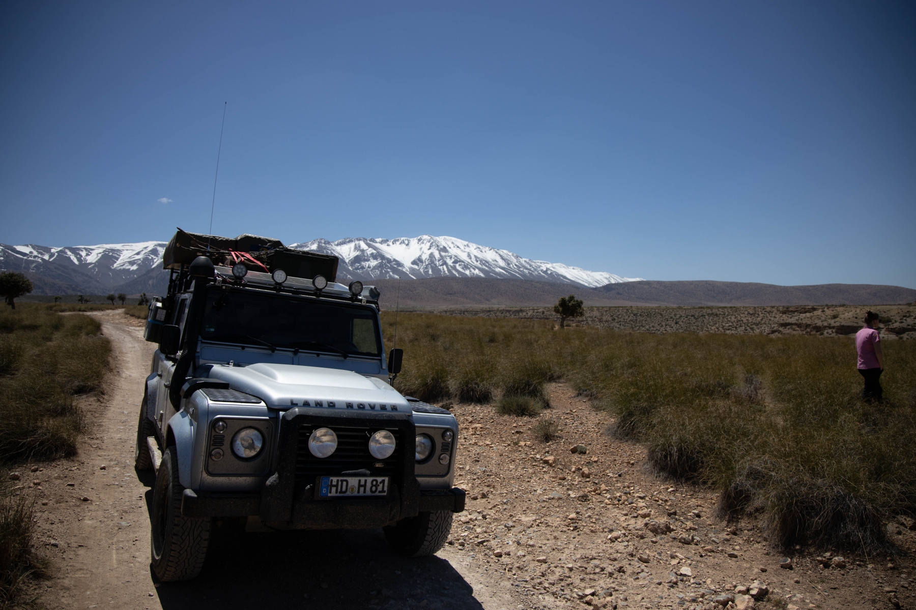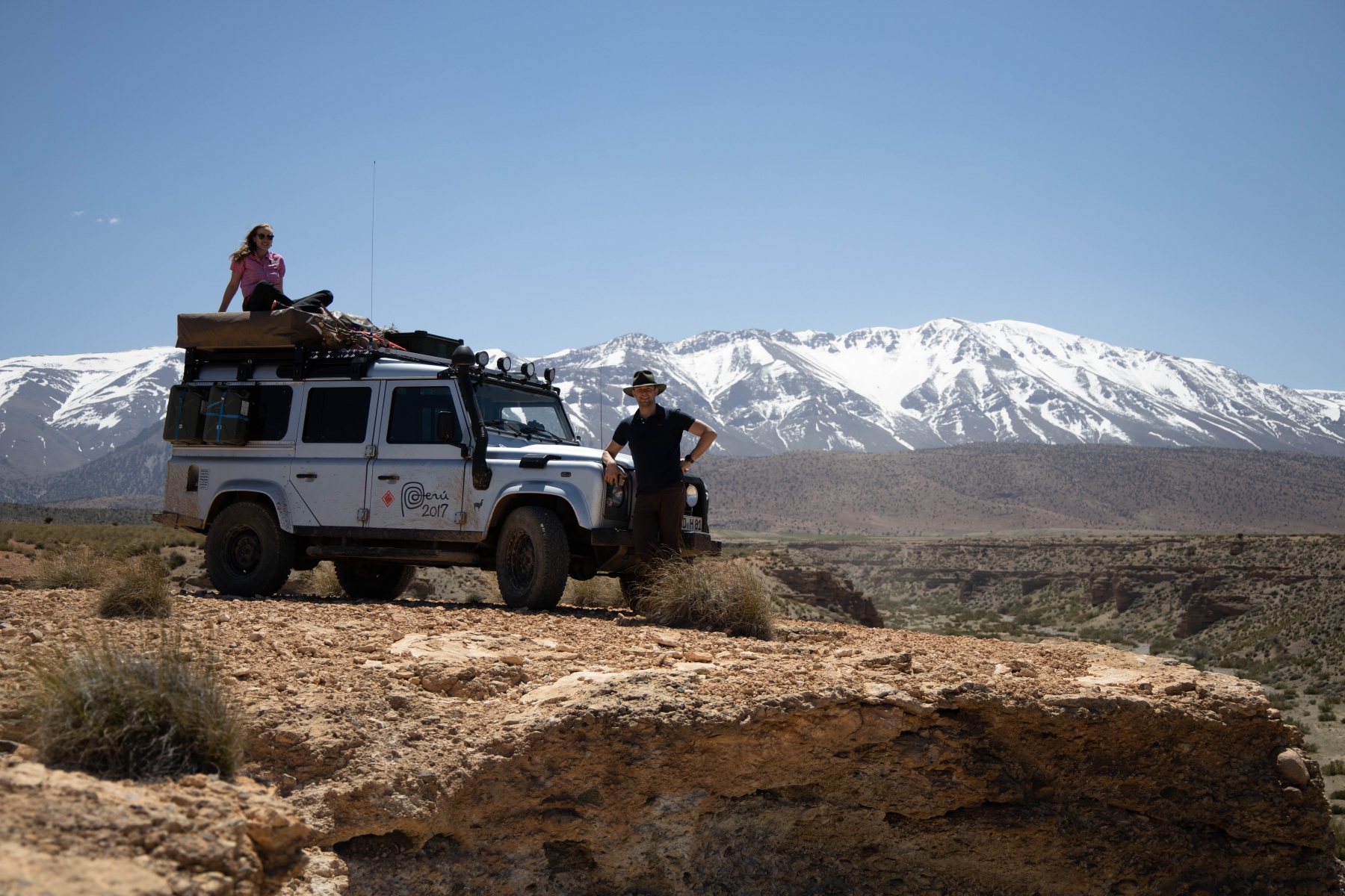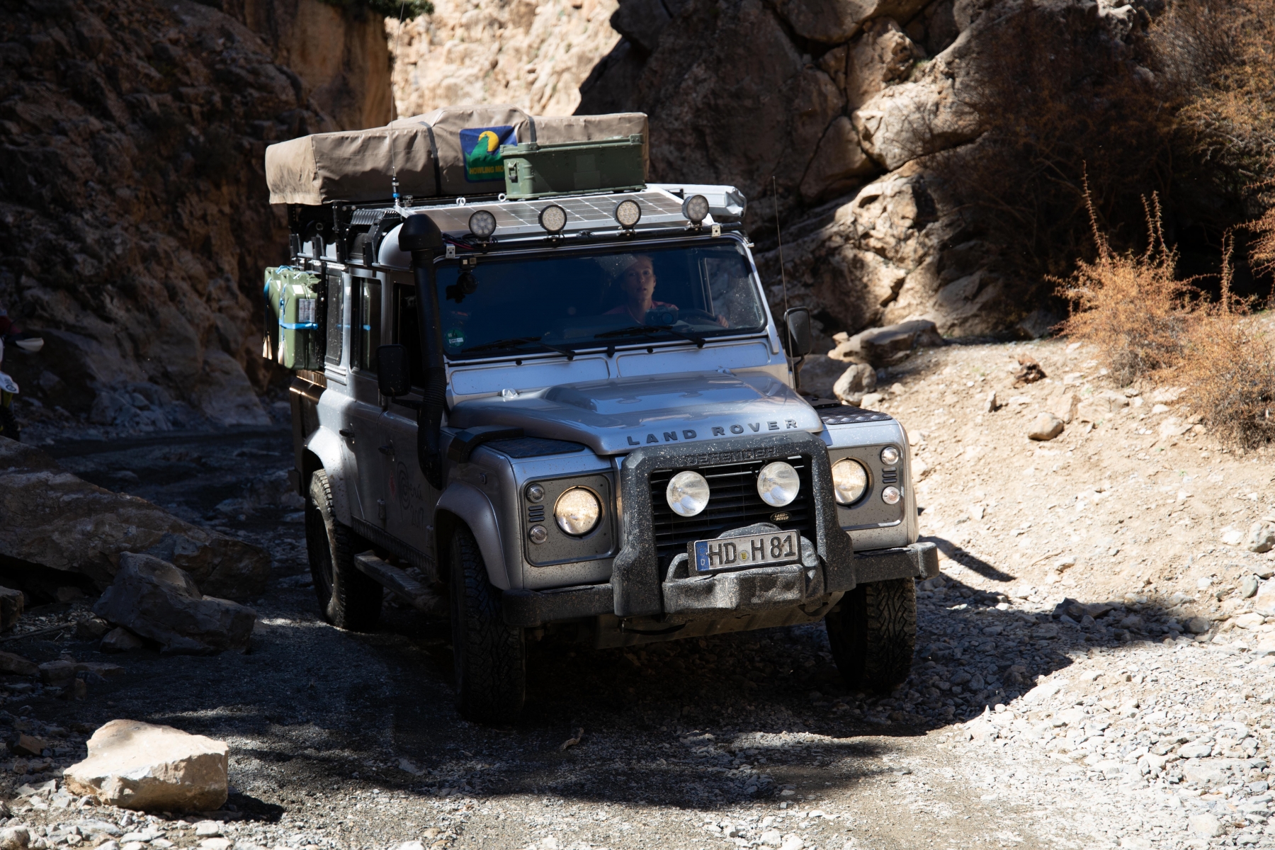 Die neue Route war aber nicht minder abenteuerlich, wenn man das, worauf wir uns per Internetrecherche vorbereitet haben, mit dem vor uns Liegenden vergleicht. Es geht über Stock und Stein und wir müssen richtig hart arbeiten, um unseren Landy sicher durch die Schlucht zu fahren. Teilweise geht es nur mit Untersetzungsgetriebe und Differenzialsperre im Schneckentempo voran, um Mensch und Material vor Schäden zu bewahren. Aber genau das wollten wir auch. Ein paar der Berber begleiten uns (also auch die Spanier, mit denen wir immer noch eine Gruppe bilden). Das hat jedoch Kalkül: man hilft uns (auch ungewollt) und verlangt hinterher Geld, Essen oder gebrauchte Klamotten für die „geleisteten Dienste“. Das wird mit der Zeit sehr anstrengend und verlangt viel Geduld. Als wir aus der Schlucht hinaus sind, öffnet sich die Landschaft erneut.