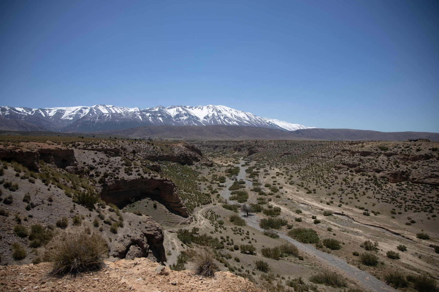 Als wir die letzte Siedlung hinter uns lassen, fahren wir parallel zum Atlasgebrige, auf dessen Gipfeln noch Schnee liegt. Gemeinsam mit einer Truppe spanischer Motorradfahrer und deren Begleitfahrzeugen folgen wir der malerischen Landschaft in den eigentlich interessanten Teil: das Flussbett. Dort erwarten und schon einige Berberkinder, die uns nach Süßigkeiten und Klamotten anbetteln. Unangenehm wird dies erst, nachdem die Kinder auf unser fahrendes Auto aufspringen und mitfahren wollen. Aber das machen die jeden Tag. Ein älterer Berber (so nennt man die Nomaden der Berge in Marokko), warnt uns vor dem eigentlichen Track, der in einigen Kilometern verschüttet sein soll. Ein paar der Spanier haben mit ihren starken Crossmaschinen eine kurze Erkundung gestartet und das Hindernis bestätigt. Also schauen wir alle auf unsere Karten und beschließen, eine parallele Piste zu befahren.