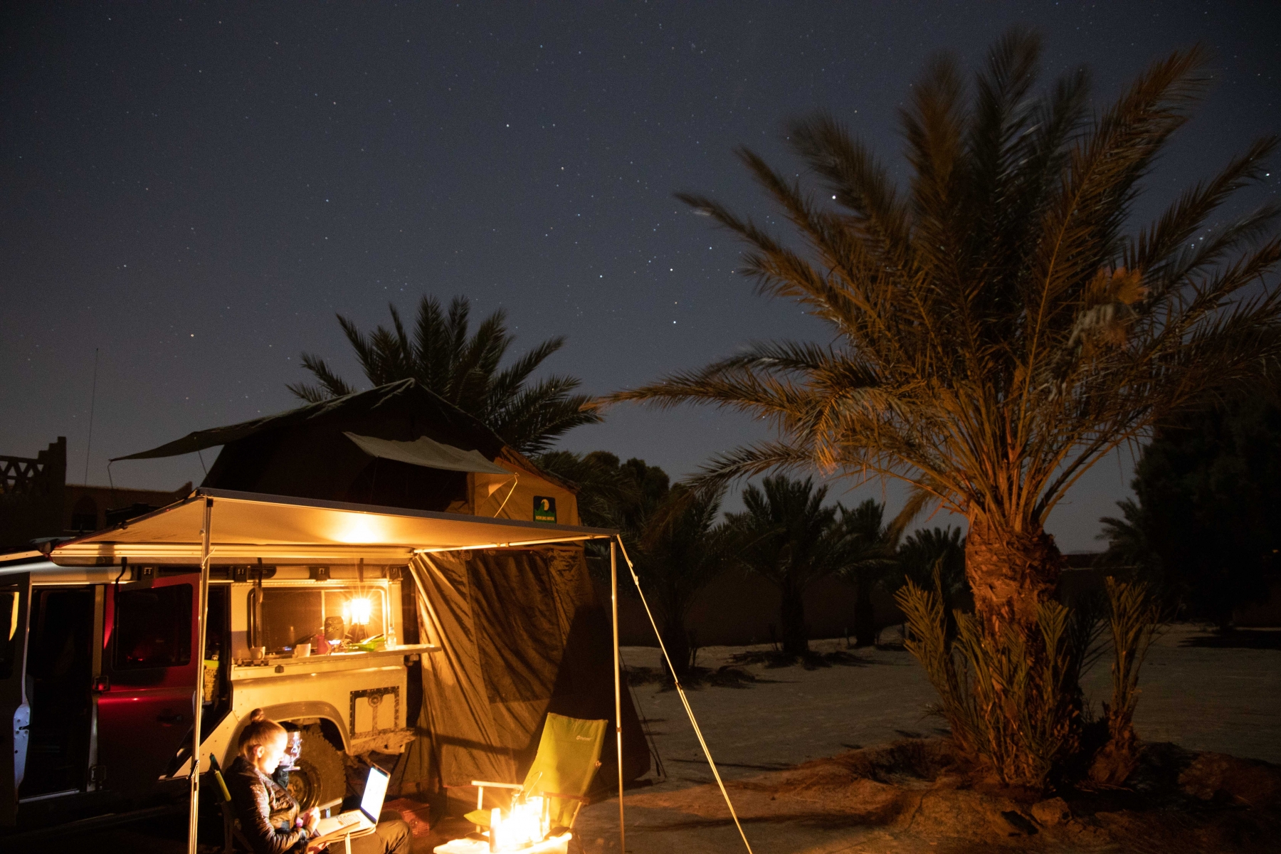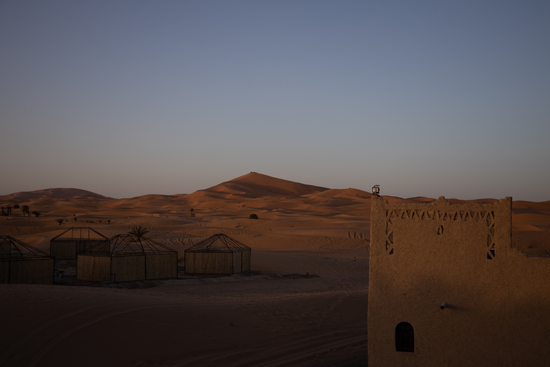 Die Landschaft änderte sich zusehends und wurde von Grünem Bewuchs über roten Fels zu gelber Wüste. Die Route Nationale 13 führt nach einem großen Stausee über mehr als hundert Kilometer an einem Fluss entlang, der links und rechts eine traumhafte lange Oase mit Palmen und Gras hat. Pünktlich zum Sonnenuntergang kamen wir am Erg Chebbi in der Kasbah Mohayut an. Diese bietet ein traumhaftes kleines Hotel mit Pool sowie einem kleinen Campingplatz direkt an den Dünen an. Kurzerhand beschließen wir, gleich zwei Nächte zu bleiben, um uns etwas zu erholen und auf die Durchquerung der Sahara vorzubereiten.